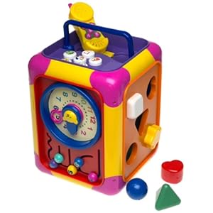 We bought this for our 16 month old son. He has had it about 4 months and still loves it. It has every thing you could want, shape sorting,put and take, buttons to push, music, phone, peek a boo. Even a clock and gears to turn. We love it, it had the most activities in one toy. We also like it that the Fisher Price shape sorter (yellow can with circle, square and triangle) shapes can also be used with it. It also makes a great gift.